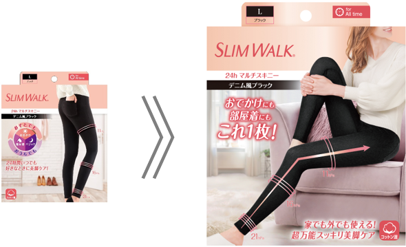 ワンマイルウェアとしても使える着圧アイテム「スリムウォーク® 24h マルチスキニー デニム風ブラック」パッケージリニューアル
