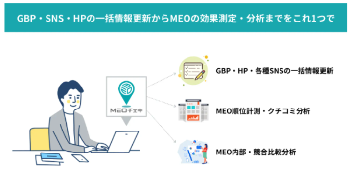 複数店舗の情報を一元管理する機能やMEO対策の分析・アクションに特化した機能など、Googleビジネスプロフィール運用に必要な機能を豊富に搭載しています。