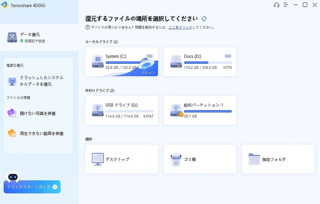 手順2.Tenorshare 4DDiGを起動させて、「外付けドライブ」を選択し、スキャンします。