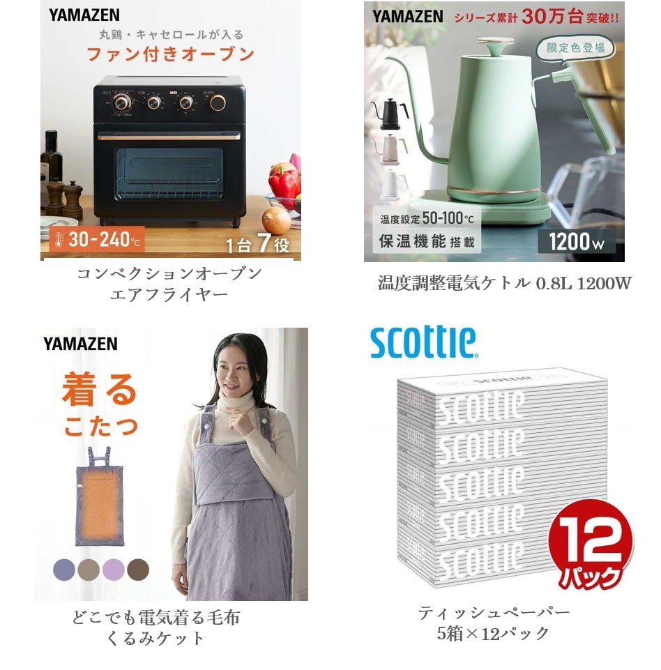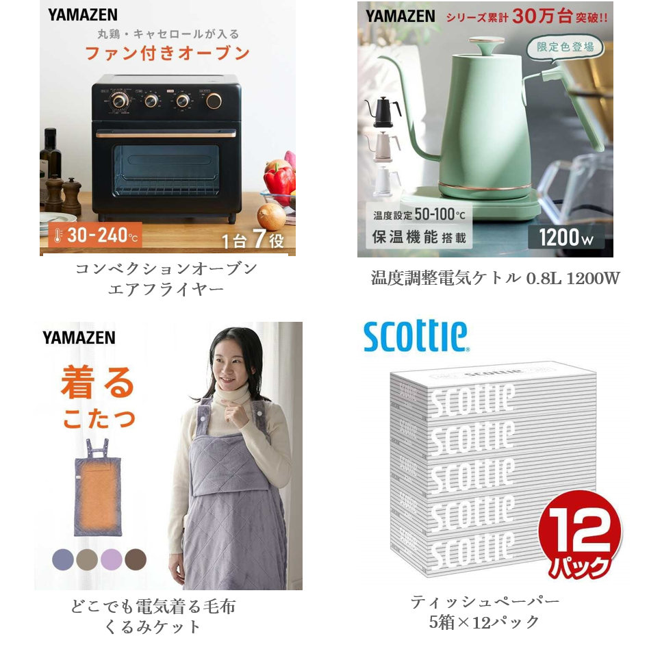 特典内容 | 特典①目玉商品の割引セール 目玉商品が最大50%割引でご購入いただけます。 特典②ポイント還元(最大20%還元) (全商品)くらしのeショップ店内、商品のご購入で:5%以上のポイント還元 (一部商品)山善ブランド商品のご購入で;10%以上のポイント還元 ※タイムセール商品は対象外となります。 特典③割引クーポン 【誰でも】 18,000円以上のご購入で利用可能な2,000円割引クーポン 5,000円以上のご購入で利用可能な500円割引クーポン 【Pontaパス会員限定】 14,000円以上のご購入で利用可能な1,500円割引クーポン 8,000円以上のご購入で利用可能な900円割引クーポン |