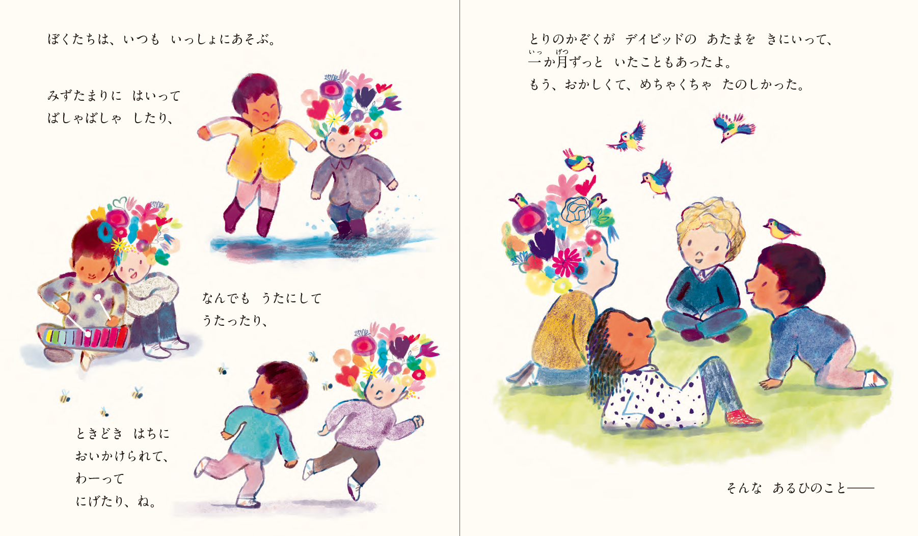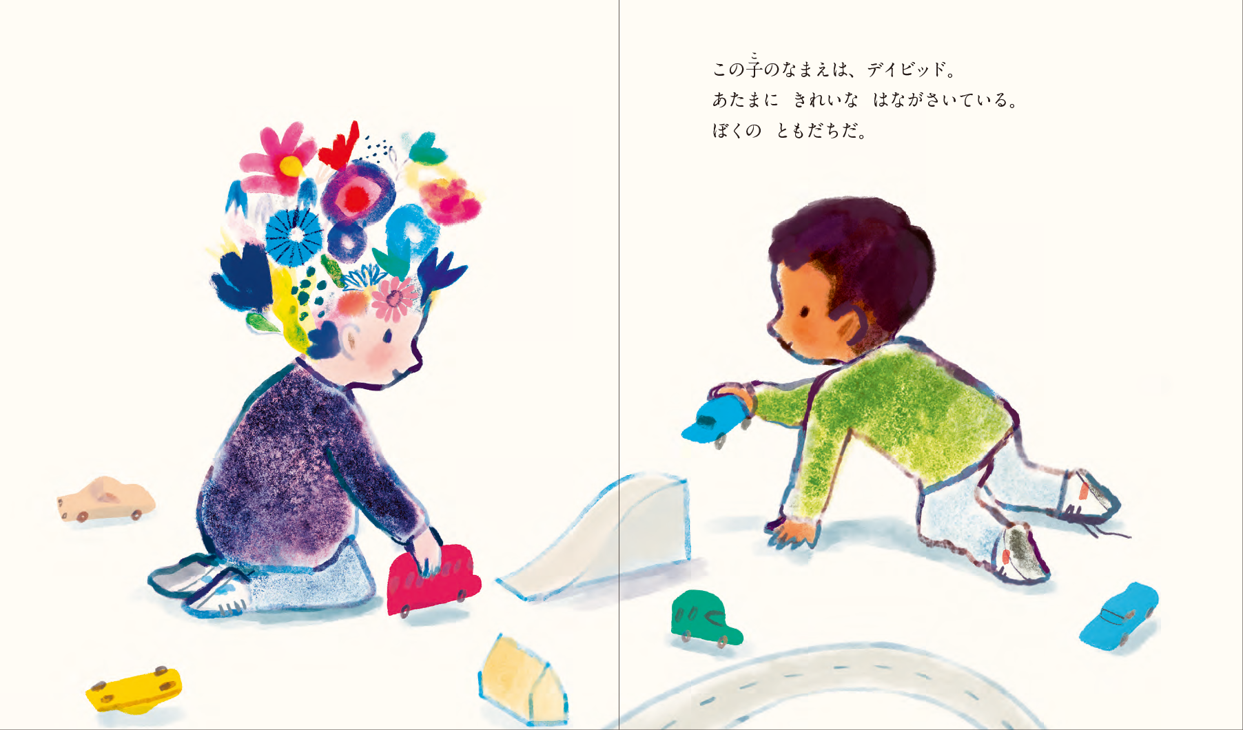 ぼくのともだち、デイビッドは あたまに きれいな はながさいている。