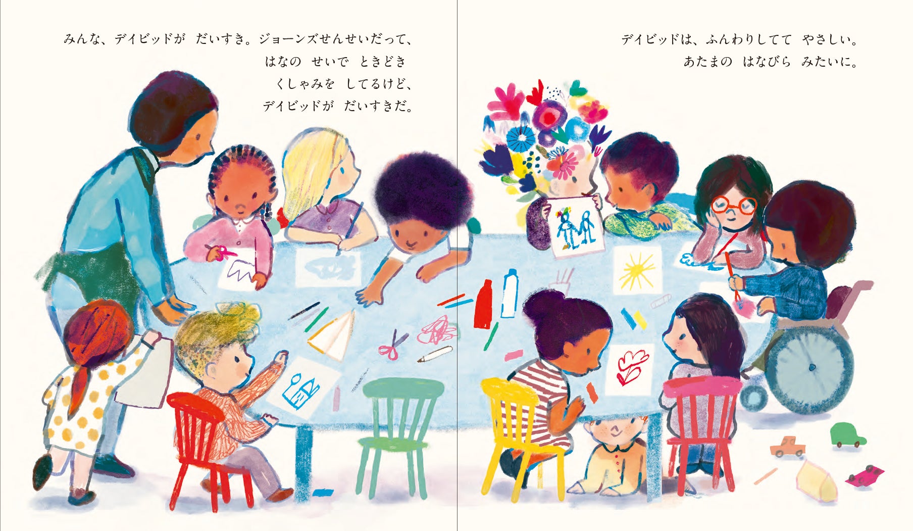 しかし、この絵本のページを開くと、さまざまな子どもたちが一緒にいるインクルーシブな世界がそこにあります。困難な状況にあるともだちのことを、頭の花やそれが散ることで表現することによって、小さい子どもにも「ぼく」のともだち、デイビッドの苦境が理解できるようになっているのではないでしょうか。