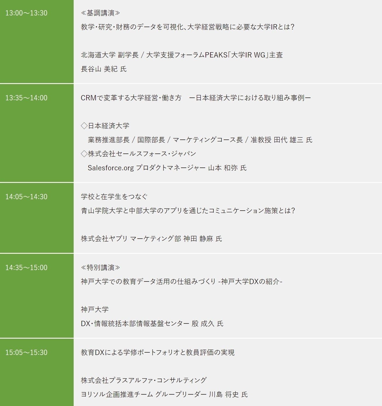 今回は、大学IRで先行する北海道大学の長谷山副学長に、最新の「データを基にした戦略的な大学経営」について基調講演をしていただきます。続いて、大学や民間企業の各登壇者より、CRMの活用や学習成果の可視化、教員評価システムの導入などについて発表いただきます。各大学の現場で課題の多いテーマから厳選しており、大学経営や教育改革に関わる方々にとって必見の内容となっております。