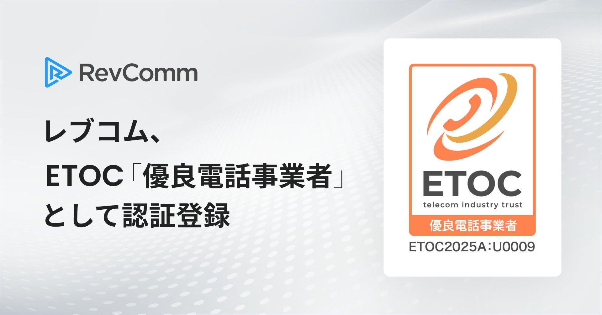 株式会社RevComm(レブコム、本社:東京都渋谷区、代表取締役:會田武史)は、電話事業者認証機構(Elite Telecom Operator Certification Body, ETOC、所在地:東京都港区、会長:近藤 邦昭)により、「優良電話事業者」として認証登録されました。