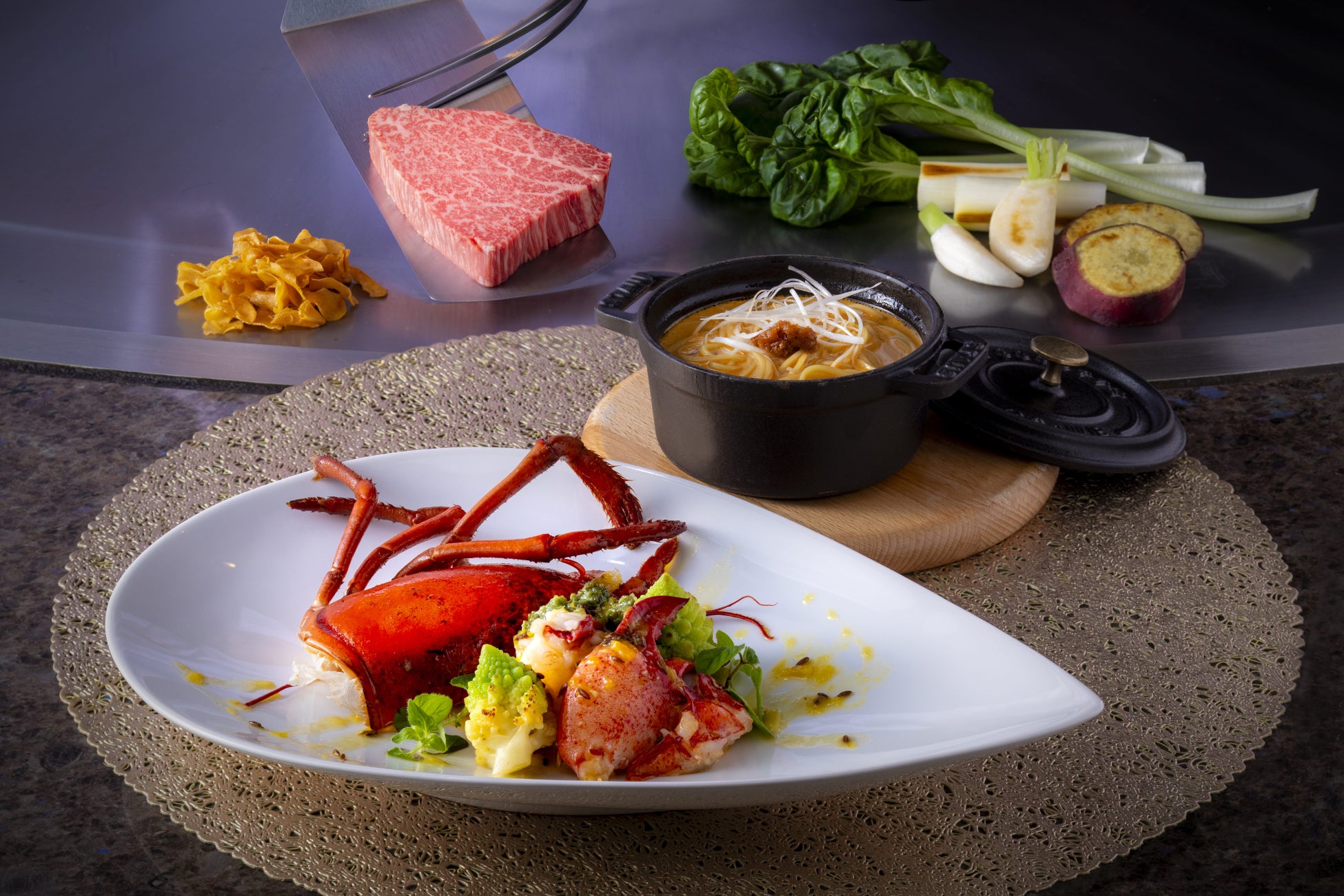 オマール海老ソテーと黒毛和牛ステーキがダイナミックに饗宴する鉄板焼コース。ぷりぷりとした身のオマール海老は、生絞りオレンジとクミンのソースで甲殻類ならではの豊かな香味がくっきりと際立ち、インパクトある味わい。熟練の技で焼き上げる黒毛和牛ステーキは、ロース130gかフィレ100gのいずれかを。そのほか、濃厚風味の海老ラーメンをイメージして創作した、揖保乃糸中華麺を使った海老のビスクスープなどもラインナップ。海老と牛肉が織り成す豪奢な美味コースをこの機会に!