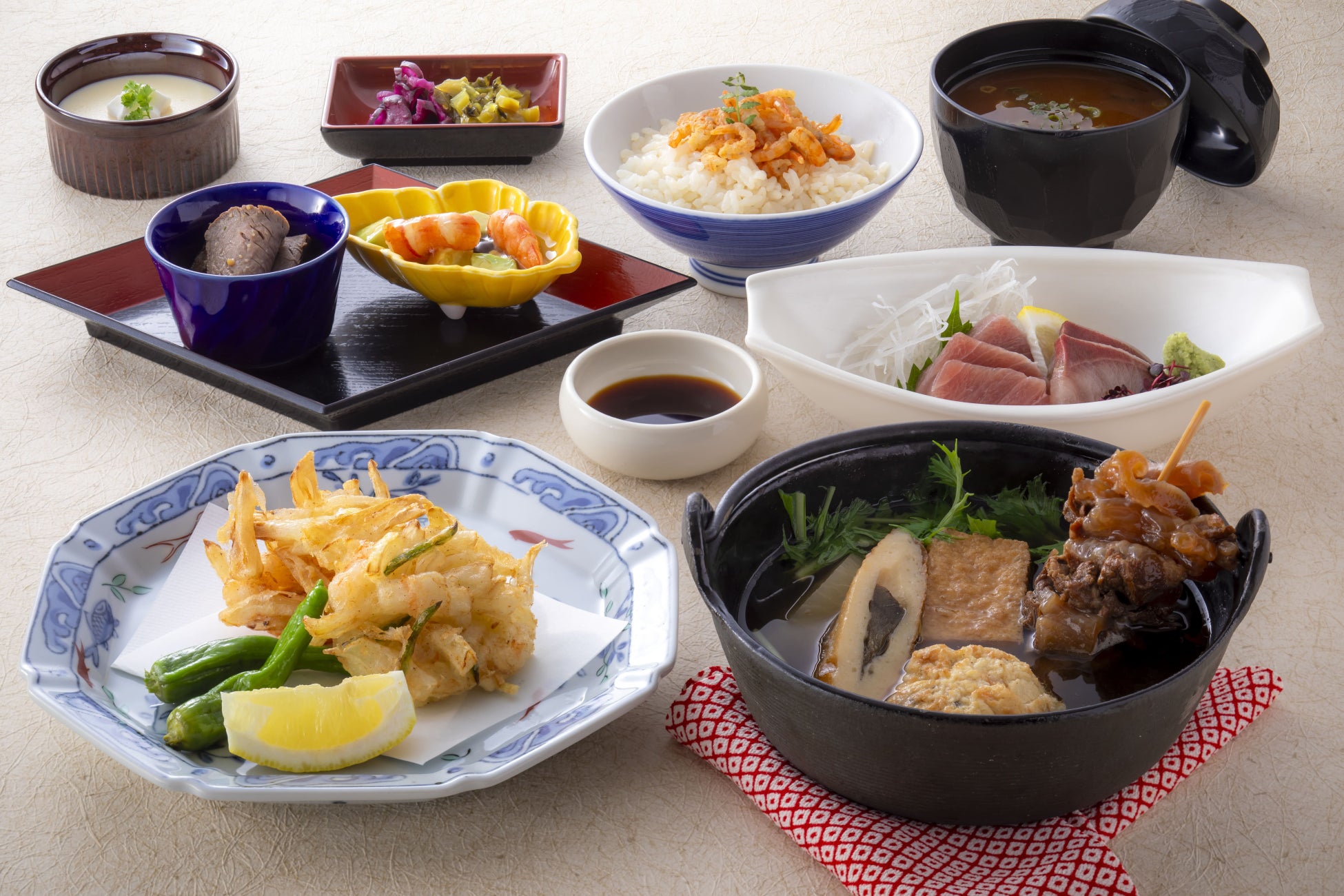 名物のおでんに、ふわふわの海老ひろうすや口の中でとろける牛すじが登場。旨みたっぷりのだしとともにほっこり豊かな風味をご堪能ください。また海老は、アボカドと合わせた前菜、サクサクのかき揚げ、干し海老ご飯でその濃厚な香味を披露。低温調理でしっとり仕上げたローストビーフや旬魚の造りなどもお愉しみに。