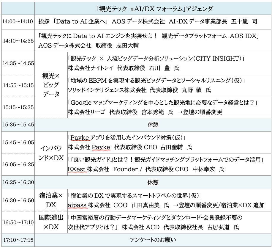 クラウドデータ、システムデータ、リーガルデータ、AIデータなどのデータアセットマネジメント事業を展開するAOSデータ株式会社(本社:東京都港区、代表取締役社長 春山 洋 以下AOSデータ)は、観光業のDXおよびAI活用の推進を目的に、「観光テックxAI/DXデータフォーラム」を、2023年8月3日に、【観光×ビッグデータ】【インバウンド×DX】【宿泊業×DX】【国際進出×DX】のセッションに7社にご登壇頂き、大手町の日経カンファレンスルームで開催いたします。