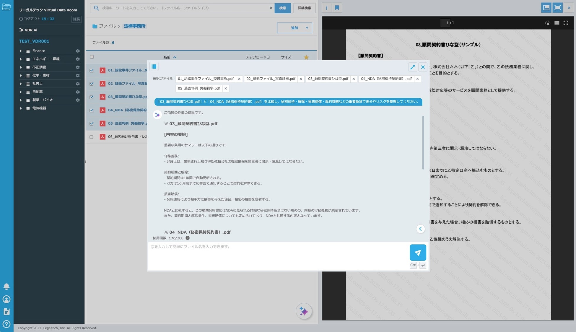 2025年6月20日 リーガルテック株式会社(本社:東京都、代表取締役:佐々木 隆仁)は、法律事務所向けに最適化したバーチャルデータルーム(VDR)「リーガルテックVDR」に、当社独自の生成AI「AI孔明」を統合した新機能をリリースしました。