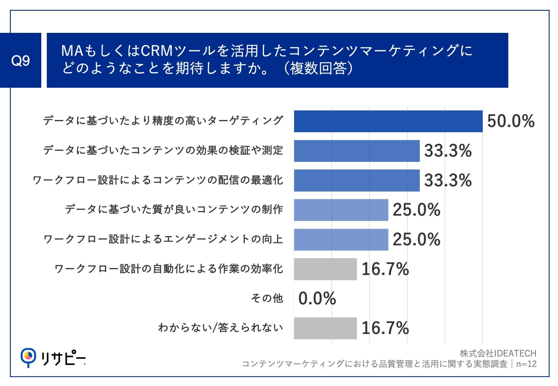 Q6で「その他のツールを活用してコンテンツマーケティングを実施している」「ツールは使わずコンテンツマーケティングを行なっている」と回答した方に、「Q9.MAもしくはCRMツールを活用したコンテンツマーケティングにどのようなことを期待しますか。(複数回答)」(n=12)と質問したところ、「データに基づいたより精度の高いターゲティング」が50.0%、「データに基づいたコンテンツの効果の検証や測定」が33.3%、「ワークフロー設計によるコンテンツの配信の最適化」が33.3%という回答となりました。