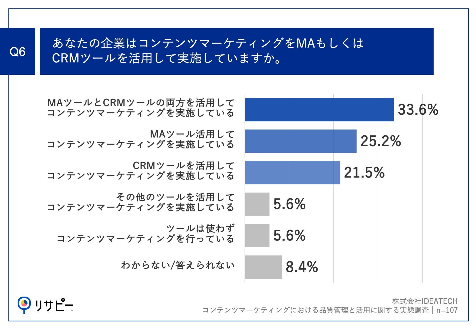 「Q6.あなたの企業はコンテンツマーケティングをMAもしくはCRMツールを活用して実施していますか。」(n=107)と質問したところ、「MAツールとCRMツールの両方を活用してコンテンツマーケティングを実施している」が33.6%、「MAツール活用してコンテンツマーケティングを実施している」が25.2%、「CRMツールを活用してコンテンツマーケティングを実施している」が21.5%という回答となりました。