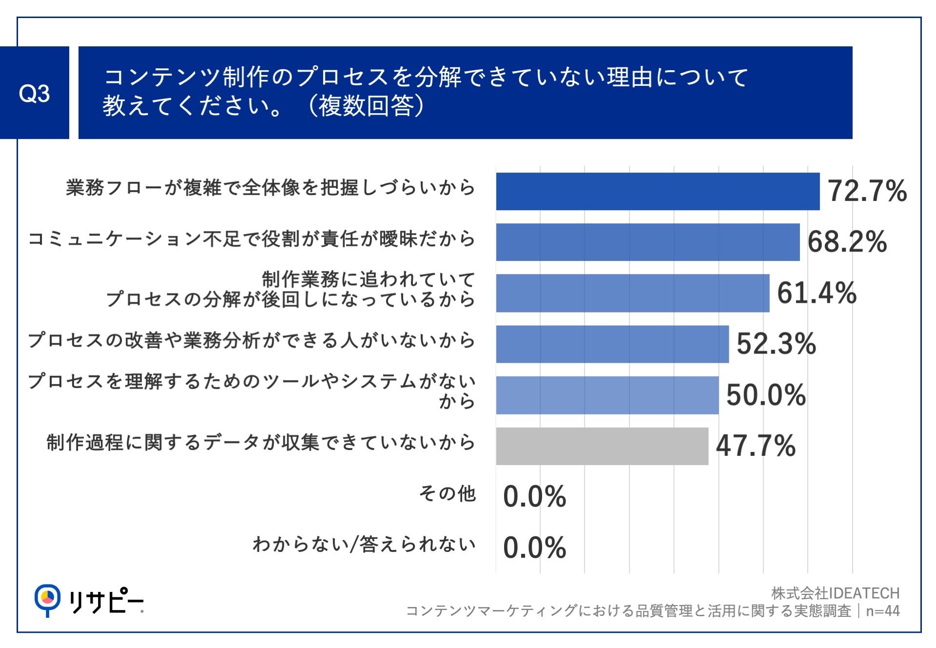 Q2で「コンテンツ制作のプロセスを分解できていないから」と回答した方に、「Q3.コンテンツ制作のプロセスを分解できていない理由について教えてください。(複数回答)」(n=44)と質問したところ、「業務フローが複雑で全体像を把握しづらいから」が72.7%、「コミュニケーション不足で役割が責任が曖昧だから」が68.2%、「制作業務に追われていてプロセスの分解が後回しになっているから」が61.4%という回答となりました。