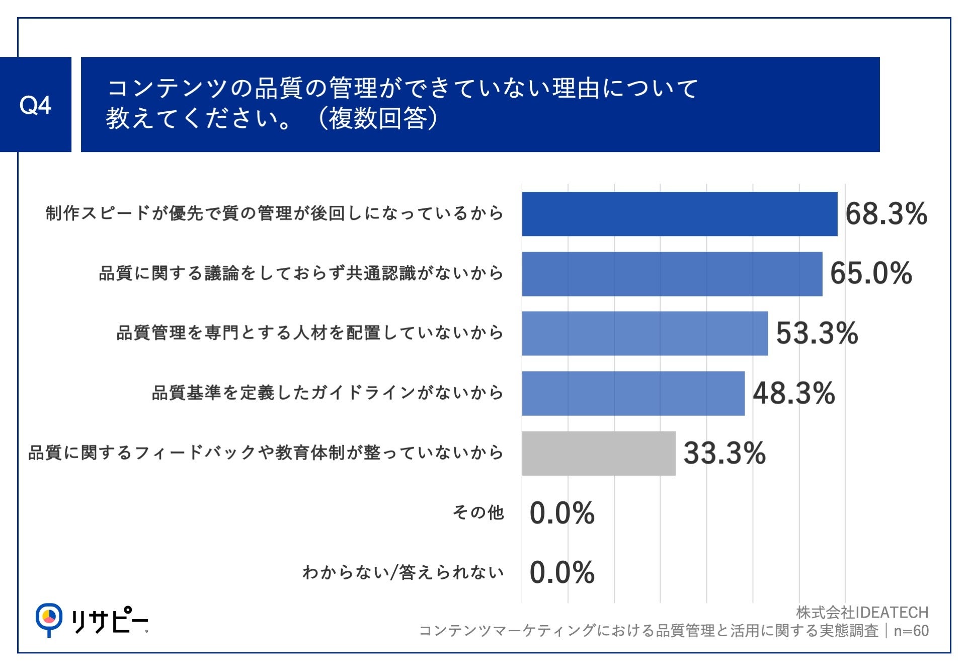 Q2で「コンテンツの品質の管理ができていないから」と回答した方に、「Q4.コンテンツの品質の管理ができていない理由について教えてください。(複数回答)」(n=60)と質問したところ、「制作スピードが優先で質の管理が後回しになっているから」が68.3%、「品質に関する議論をしておらず共通認識がないから」が65.0%、「品質管理を専門とする人材を配置していないから」が53.3%という回答となりました。