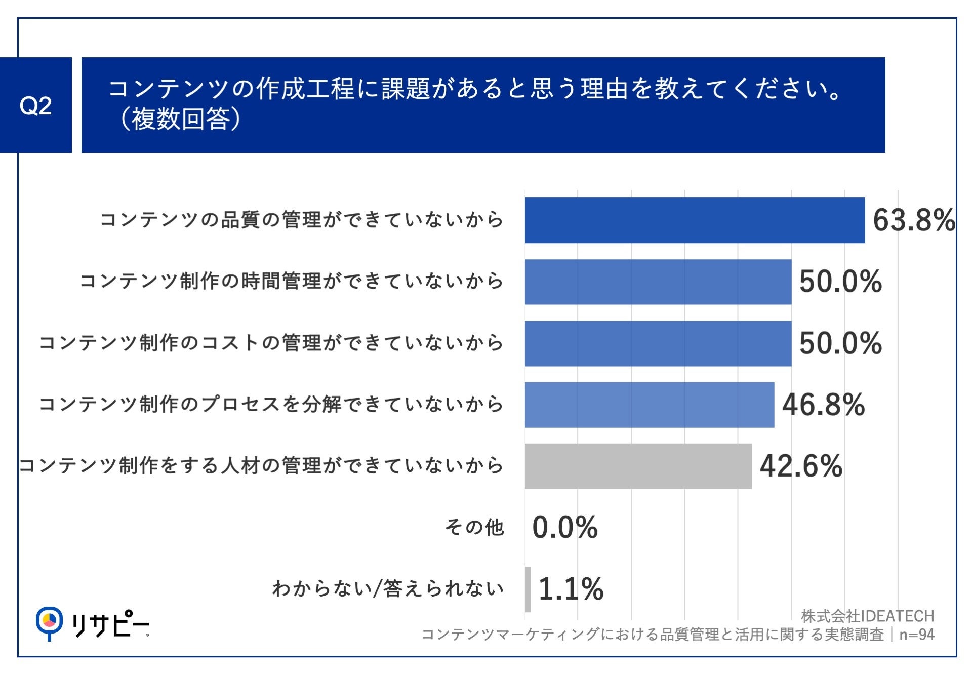 Q1で「非常にそう思う」「ややそう思う」と回答した方に、「Q2.コンテンツの作成工程に課題があると思う理由を教えてください。(複数回答)」(n=94)と質問したところ、「コンテンツの品質の管理ができていないから」が63.8%、「コンテンツ制作の時間管理ができていないから」が50.0%、「コンテンツ制作のコストの管理ができていないから」が50.0%という回答となりました。