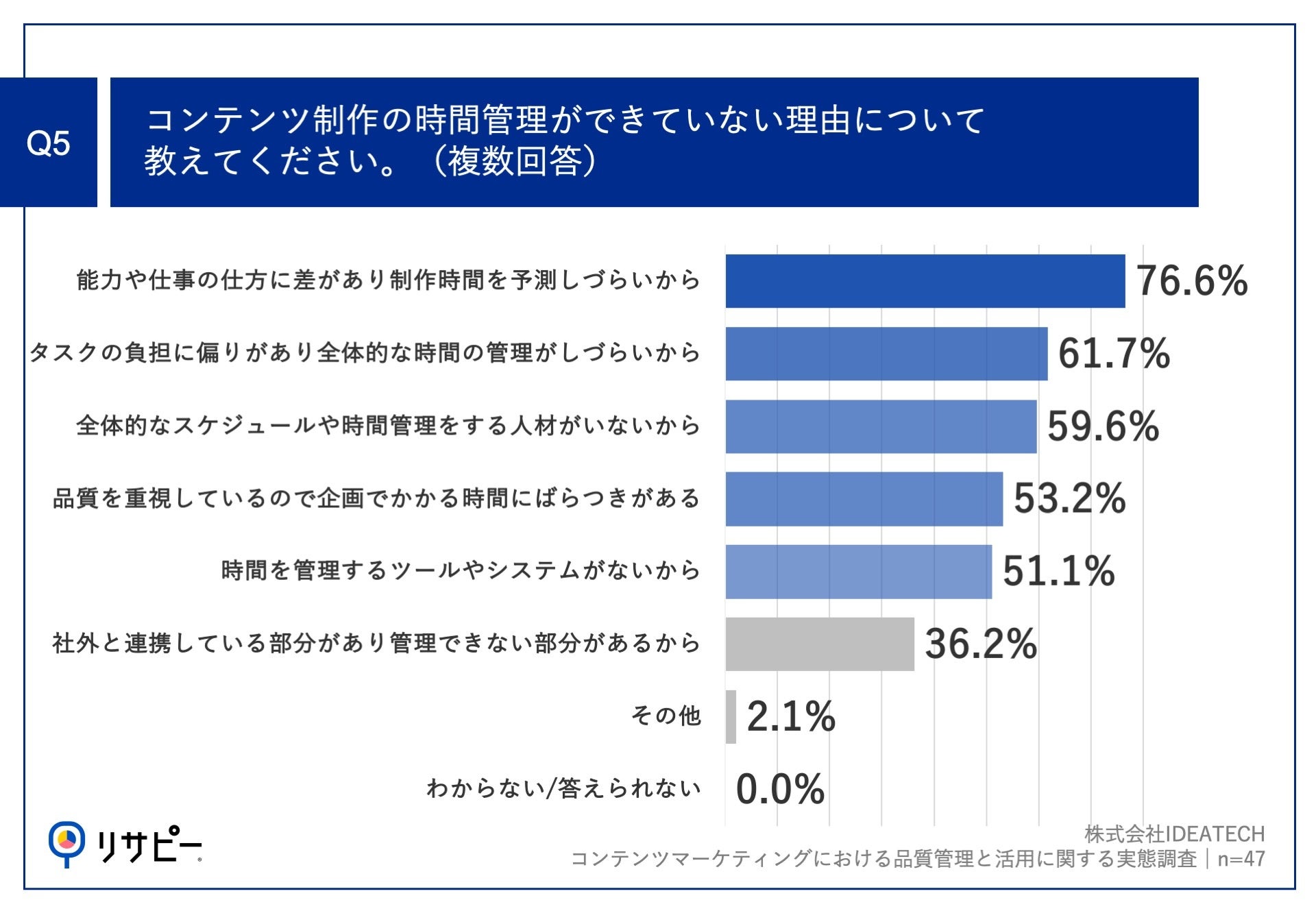 Q2で「コンテンツ制作の時間管理ができていないから」と回答した方に、「Q5.コンテンツ制作の時間管理ができていない理由について教えてください。(複数回答)」(n=47)と質問したところ、「能力や仕事の仕方に差があり制作時間を予測しづらいから」が76.6%、「タスクの負担に偏りがあり全体的な時間の管理がしづらいから」が61.7%、「全体的なスケジュールや時間管理をする人材がいないから」が59.6%という回答となりました。