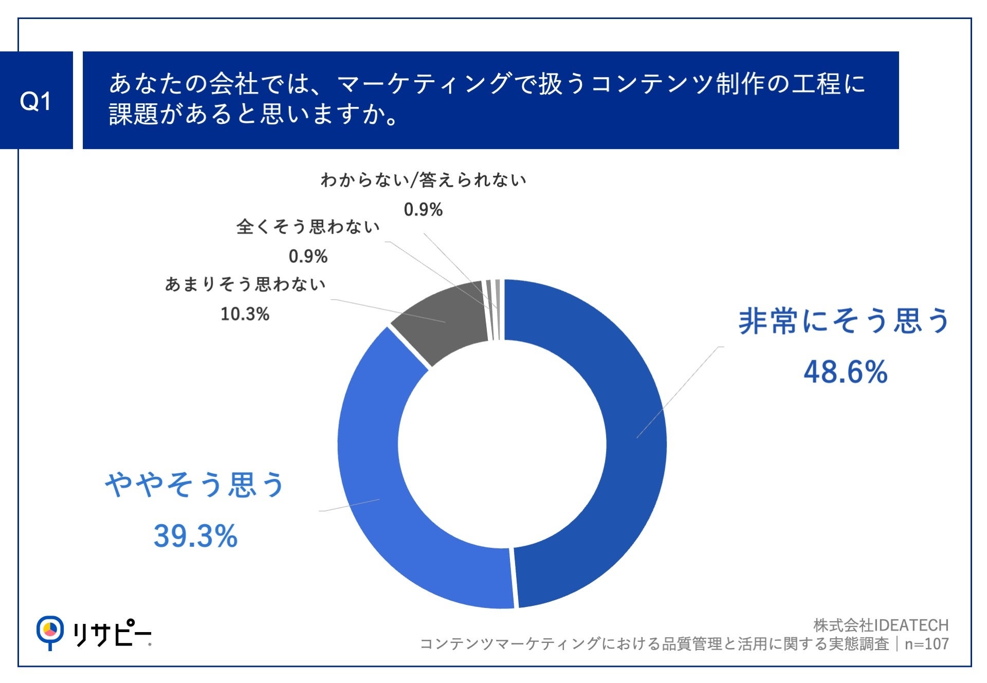 「Q1.あなたの会社では、マーケティングで扱うコンテンツ制作の工程に課題があると思いますか。」(n=107)と質問したところ、「非常にそう思う」が48.6%、「ややそう思う」が39.3%という回答となりました。