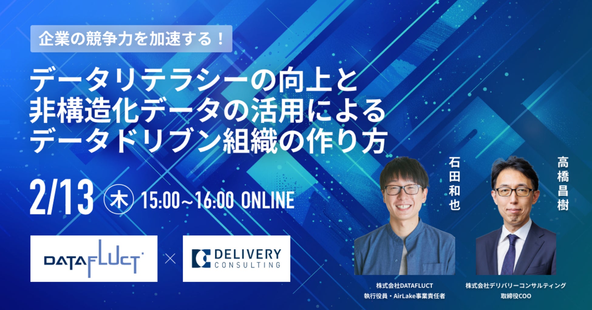 データサイエンスで企業と社会の課題を解決する株式会社DATAFLUCT(本社所在地:東京都渋谷区、代表取締役CEO:久米村 隼人、以下「DATAFLUCT」)は、2025年2月13日(木)15:00から、無料ウェビナー「企業の競争力を加速する!データリテラシーの向上と非構造化データの活用によるデータドリブン組織の作り方」を開催します。