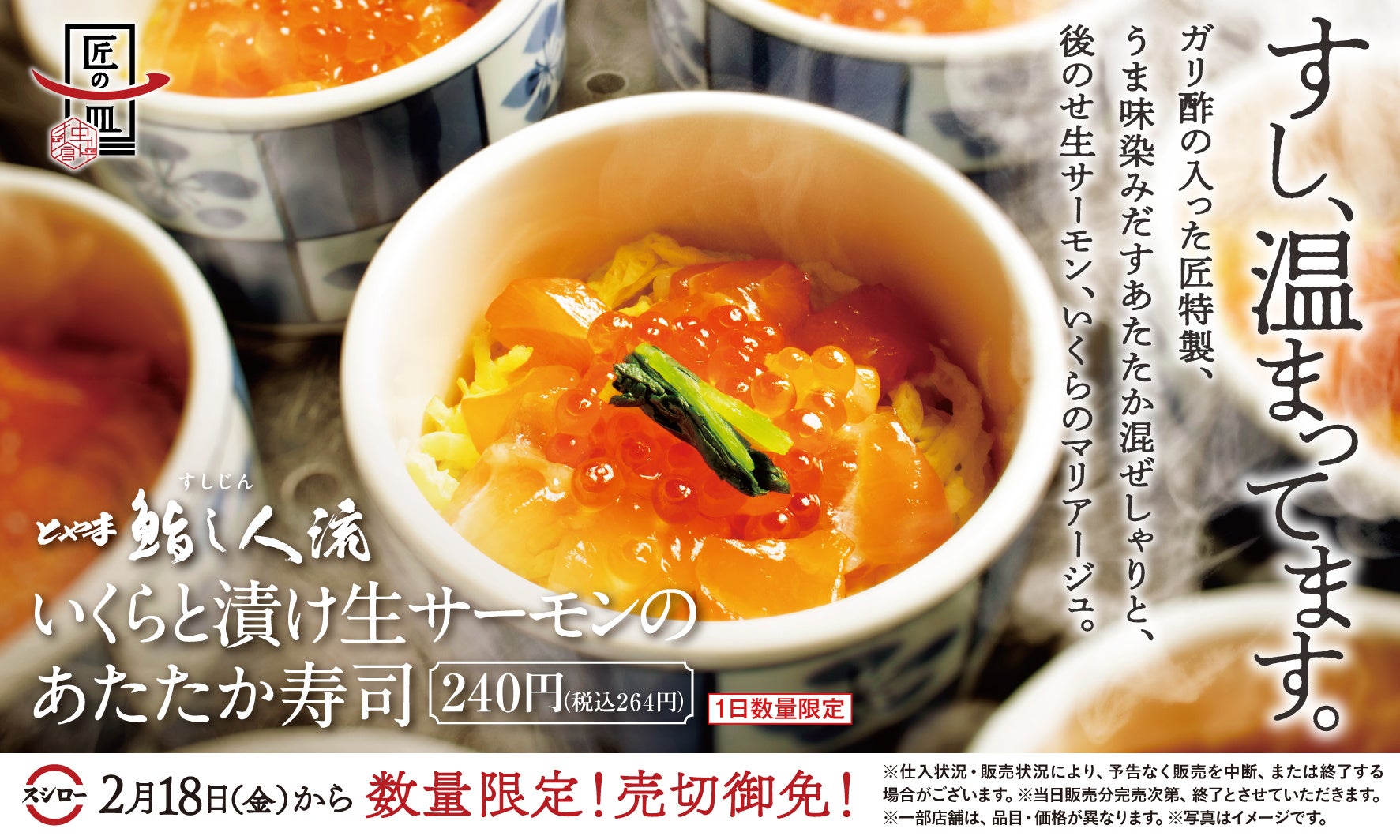 株式会社あきんどスシロー(本社:大阪府吹田市、代表取締役社長:堀江 陽)は、名店の匠とタッグを組んで“回転すしの常識を変える逸品”を提供する『匠の一皿 第二章 独創』編において、富山県のすしの名店「鮨し人(すしじん)」の職人で、素材の旨みを引き出す独自のアプローチで業界からも一目置かれる存在の木村 泉美氏考案の新商品「いくらと漬け生サーモンのあたたか寿司」を、2月18日(金)より期間限定で販売いたします。