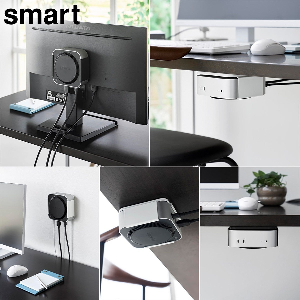 対応する小型PCを、モニター背面・デスク下・壁面の3通りで収納できるラックです。