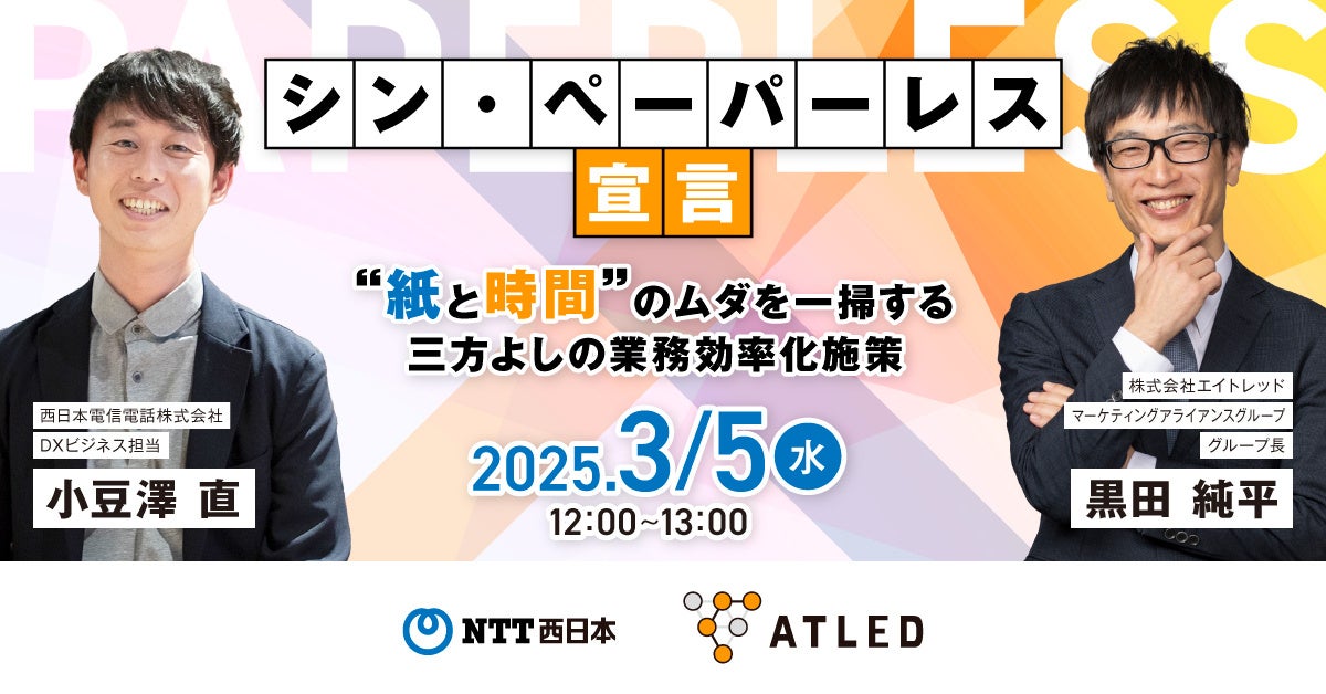 ワークフローシステムのリーディングカンパニーであるエイトレッド(本社:東京都渋谷区、代表取締役社長:岡本 康広 以下、エイトレッド)は、西日本電信電話株式会社と共催でオンラインセミナー『「シン・ペーパーレス宣言」”紙と時間”のムダを一掃する三方よしの業務効率化施策』を2025年3月5日(水)に開催いたします。