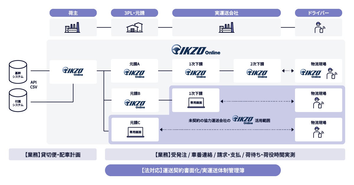 今回の機能強化により、元請や1次請け、2次請け以降の多段階の企業がデータでつながり、多重下請構造を貫く企業間のデータ連携が可能となります。荷主は協力運送会社のドライバーの荷待ち・荷役等時間など作業状況までを管理できるようになります。IKZO Onlineから発注すると、新物流2法で求められる多段階の運送契約の書面化や実運送体制管理簿の作成(請負階層の自動表示)、さらに物流現場での荷待ち・荷役等時間の管理から実績を基にした請求までが一元化でき、サプライチェーンにおける物流業務の効率化をはかることができます。