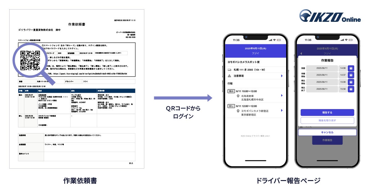 IKZO Online未契約の協力運送会社は、 認証情報を用いて個別に発行されたIDとパスワードを入力し協力運送会社専用サイトよりアクセスし、案件情報、運送申込書、作業依頼書などをダウンロードでき、運送引受の回答、車番連絡の入力・変更、請負階層の入力が可能です。また未契約の協力運送会社のドライバーは、作業報告書に表示されるQRコードからIKZO Onlineの「ドライバー報告ページ」にアクセスし、スマートフォンのWebブラウザから運送情報を閲覧できるほか、荷待ち・荷役作業等の実績報告が可能です。