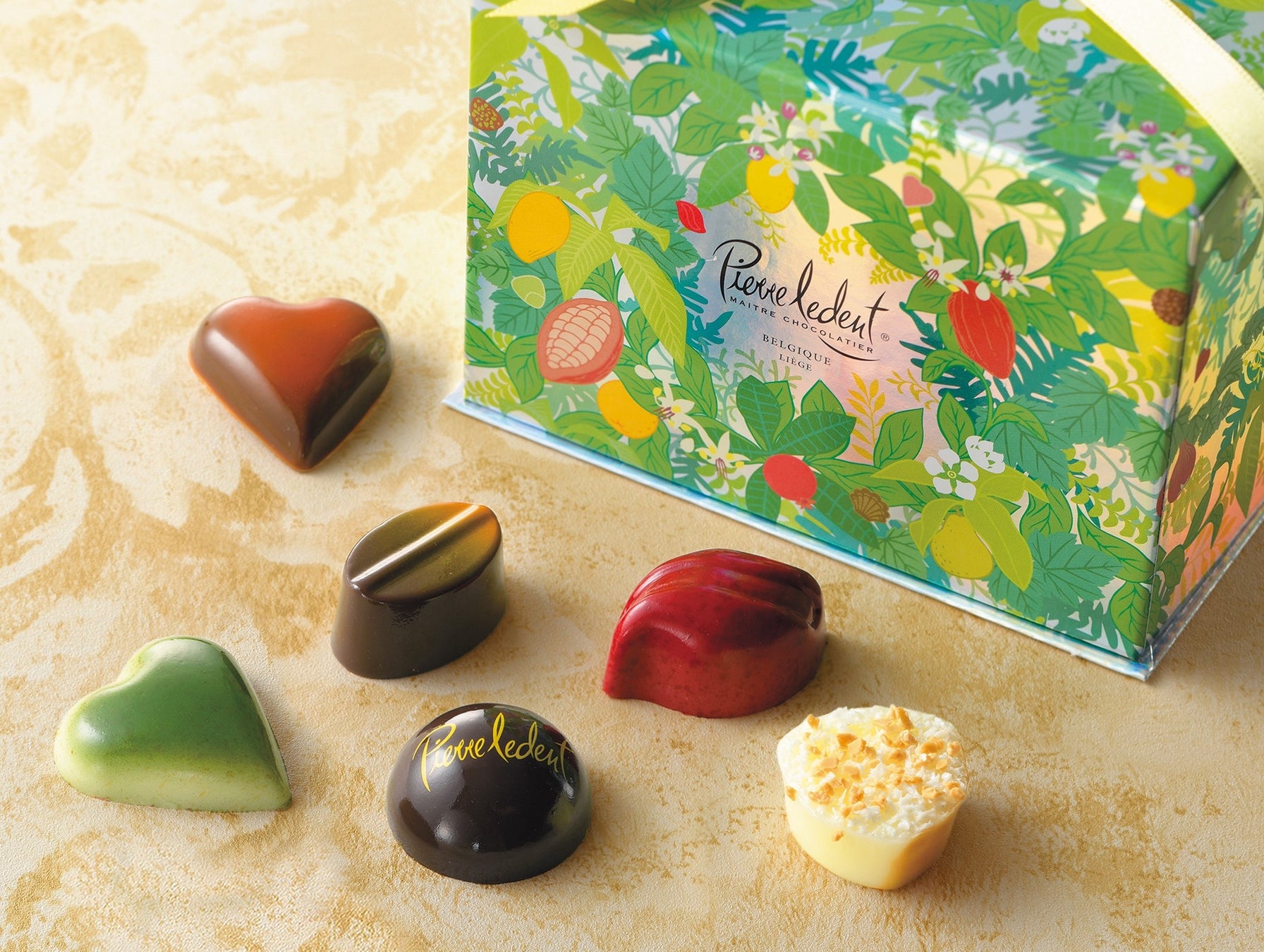 ベルギー・リエージュ出身のパティシエ・ショコラティエであるピエール・ルドン氏。世界各国の菓子コンクールでの受賞歴を持つ同氏が手掛けるチョコレートは、毎年バレタインシーズンにのみ冷蔵空輸で届きます。今年は“カカオのジャングル”をテーマに、パッションフルーツのプラリネ「サミィ」や香ばしいブロンドショコラに塩をアクセントに効かせた「ジャネット」などの新作から人気のフレーバーまで、10種を2段ボックスに詰めました。