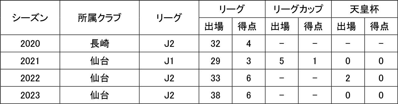 所属歴/高柳FC – カナリーニョFC – カナリーニョFCJrユース – ジェフユナイテッド千葉U-18 – 専修大 – V・ファーレン長崎 – ベガルタ仙台