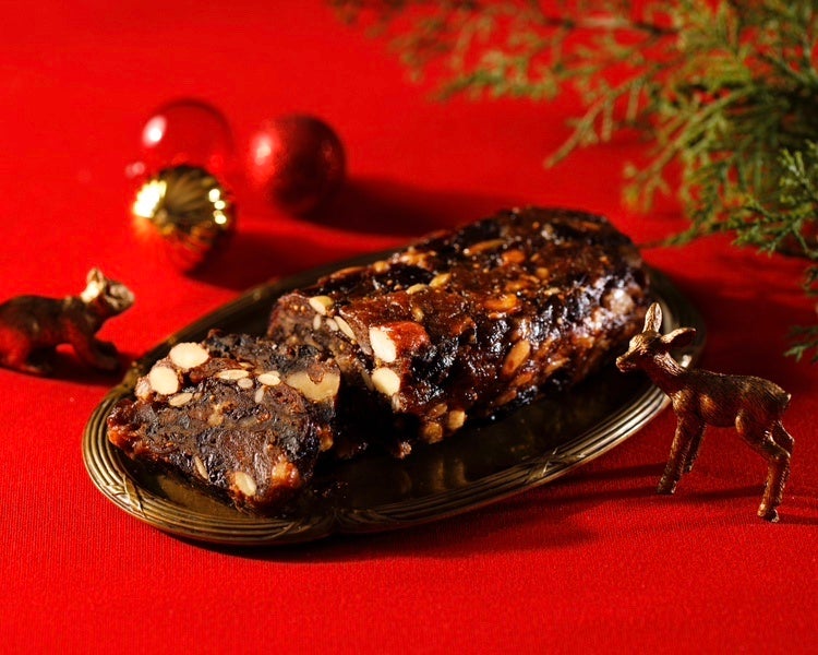 イギリスの伝統的なクリスマス菓子。ドライイチジク、ドライプルーン、レーズン、デーツとナッツを使ったケーキです。