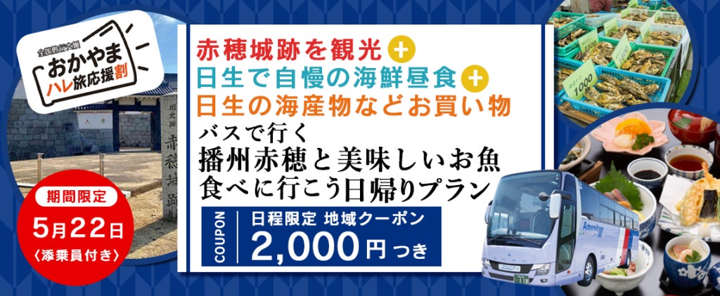 添乗、岡たけし『推しツアー』〈おかやまハレ旅応援割〉5月22日(月)出発〈添乗員付き〉赤穂城跡を観光+日生で昼食+日生の海産物などお買い物 バスで行く『播州赤穂と美味しいお魚食べに行こう日帰りプラン』