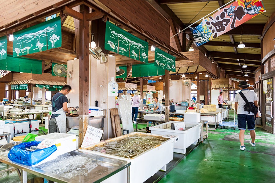 ひなせの台所、五味の市です。旬の新鮮な魚介類や、シーズンになれば新鮮な牡蠣を販売しています。ひなせの漁師の女将さんたちが威勢のいい掛け声で商品をオススメしてくれます。