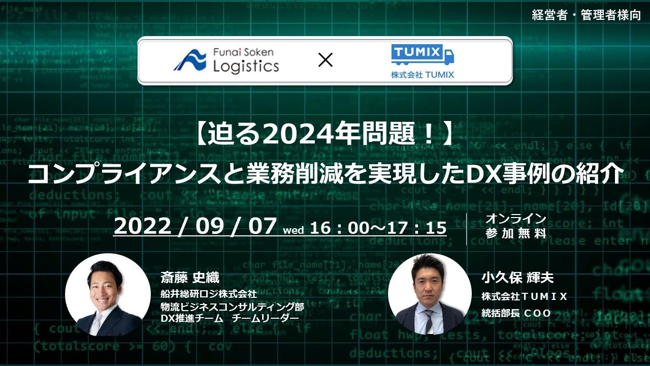 【迫る2024年問題!】コンプライアンスと業務削減を実現したDX事例の紹介(株式会社TUMIX主催)にて、船井総研ロジのコンサルタントが講演します
