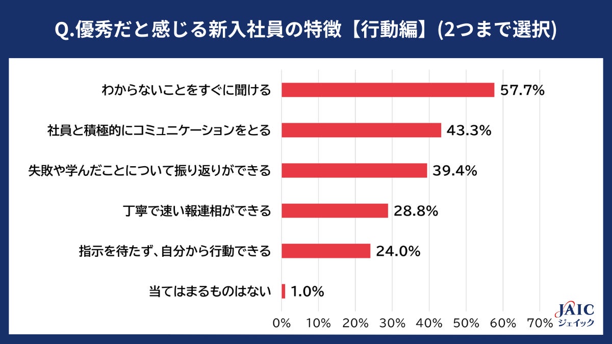 ■優秀だと感じる新入社員の特徴【行動編】:1位「わからないことをすぐに聞ける」(57.7%)