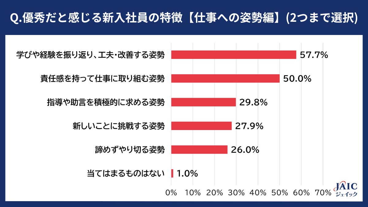 ■優秀だと感じる新入社員の特徴【仕事への姿勢編】:1位「学びや経験を振り返り、工夫・改善する姿勢」(57.7%)