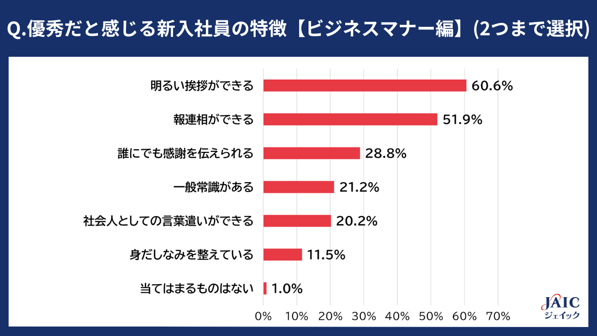 ■優秀だと感じる新入社員の特徴【ビジネスマナー編】:1位「明るい挨拶ができる」(60.6%)