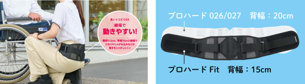 腹部の幅11.5㎝、背部の幅15㎝と、当社人気のプロハードシリーズの中で最も細幅。身体をひねる動きやしゃがんだ時の動きを邪魔しにくいです。