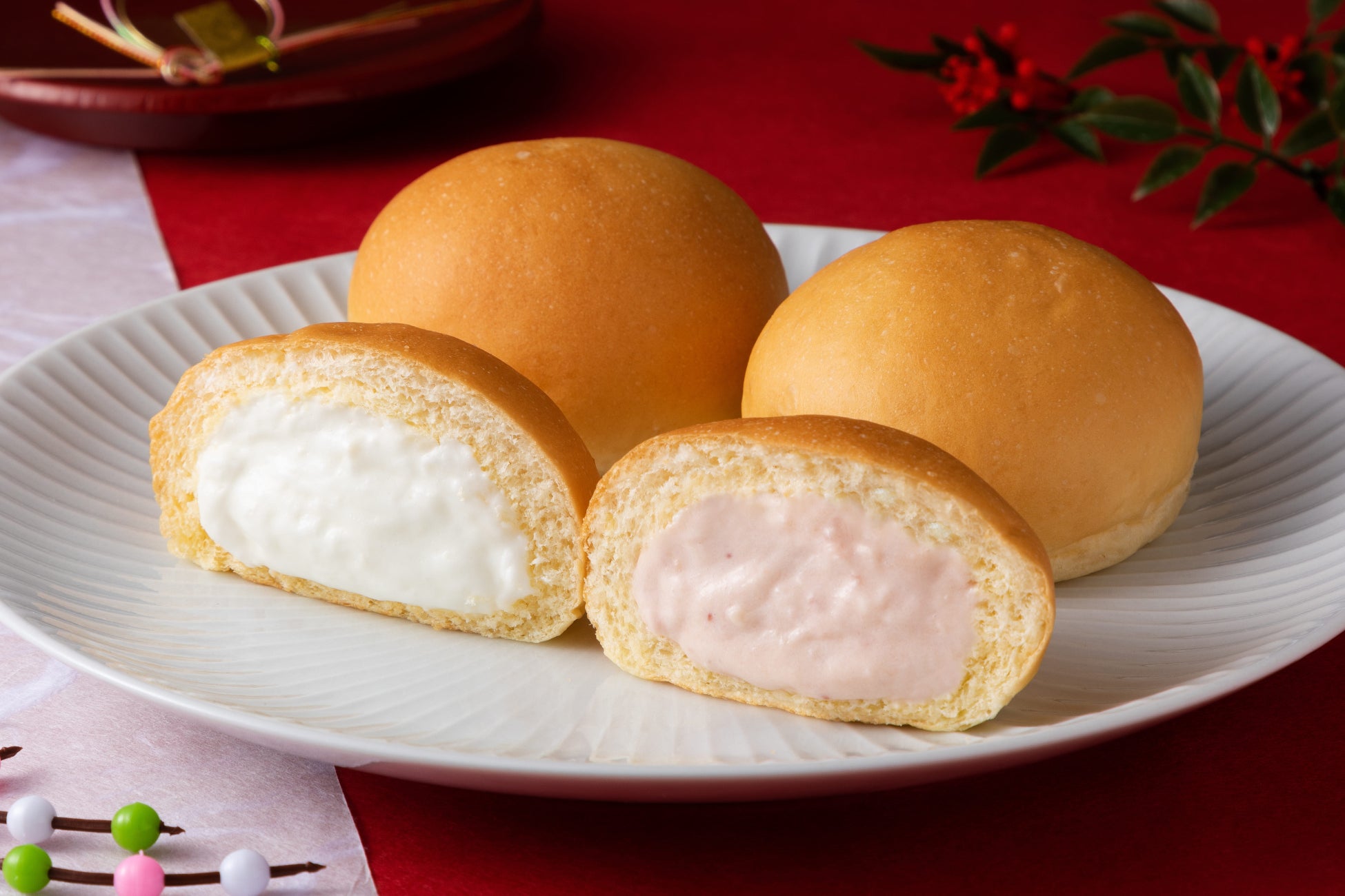 北海道産生乳100%の牛乳で作った特製ミルククリームを入れた優しい甘さと風味の「くりーむパンみるく」と、あまおう苺の甘みと酸味をバランスよく感じられる「くりーむパンいちご」の2種類をラインアップ。厄除けの縁起の良い花である梅の花や、和を感じられる霞模様があしらわれた、お年賀BOXでお届けします。