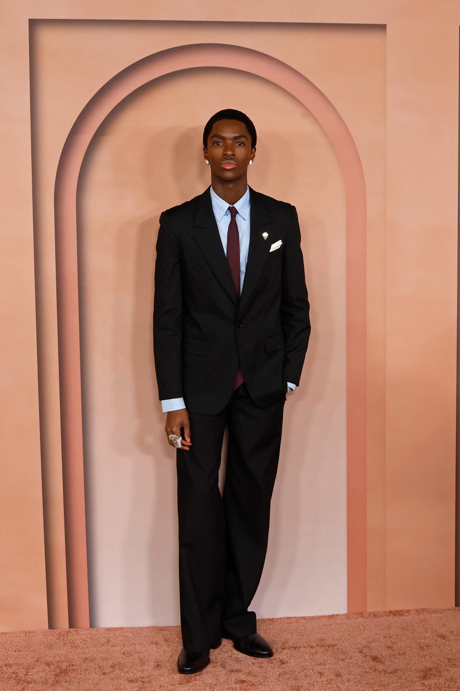 モデルのアルトン・メイソンは、2025年11月23日、カタール・ドーハのイスラム美術館で今年初の開催となった「フランカ・ファンド・ガラ」にて、ブラック GGパターン ウール セットアップ、ブローチ、ライトブルーのGGパターン シャツ、ボルドー シルクタイとブラックレザーのレースアップシューズを着用しました。