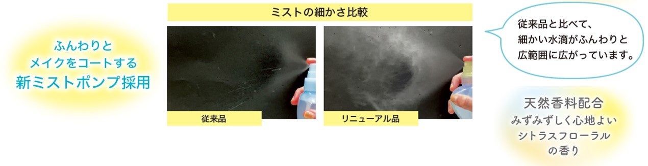従来品よりもさらに細かいミストで、みずみずしくベタつかずに、メイクをしっかり固定します。