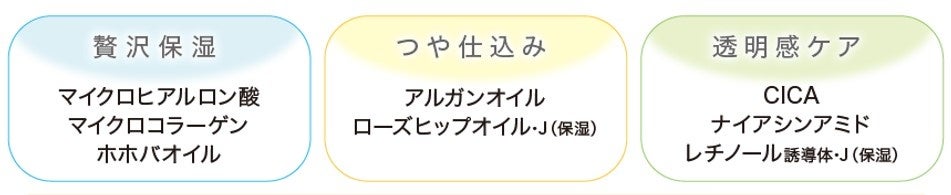 アルガンオイルはアルガニアスピノサ核油、ローズヒップオイルはカニナバラ果実油、CICAはツボクサ葉エキス、Jはホホバ種子油です。