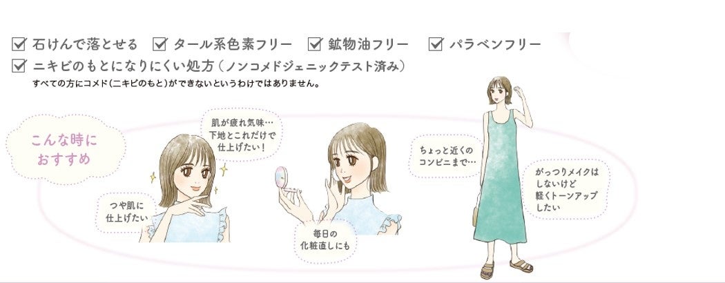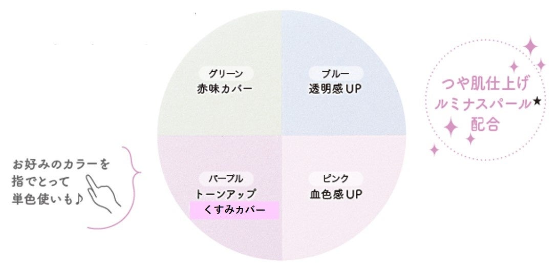 4色のカラーコントロール機能で肌悩みをマルチにカバー。8種の美容成分を贅沢に配合し、透明感あふれる生つや肌をかなえます。