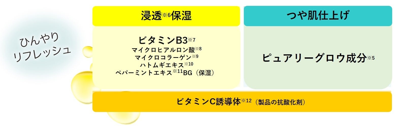 ※6 角層まで ※7 ナイアシンアミド ※8 加水分解ヒアルロン酸 ※9 加水分解コラーゲン ※10 ハトムギ種子エキス ※11 セイヨウハッカ葉エキス ※12 アスコルビン酸硫酸2Na