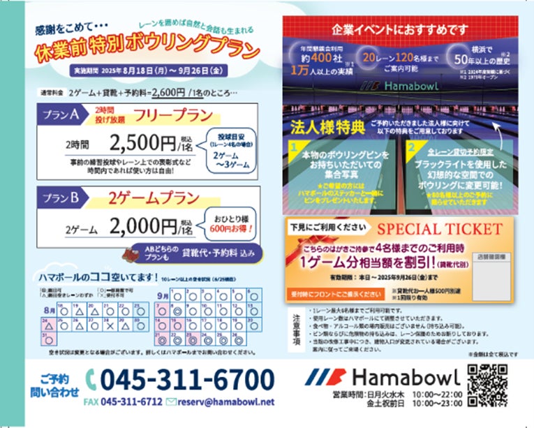 ・時 間:ハマボール営業中常時受付 ※ただし、閉店1時間前が最終受付となります。