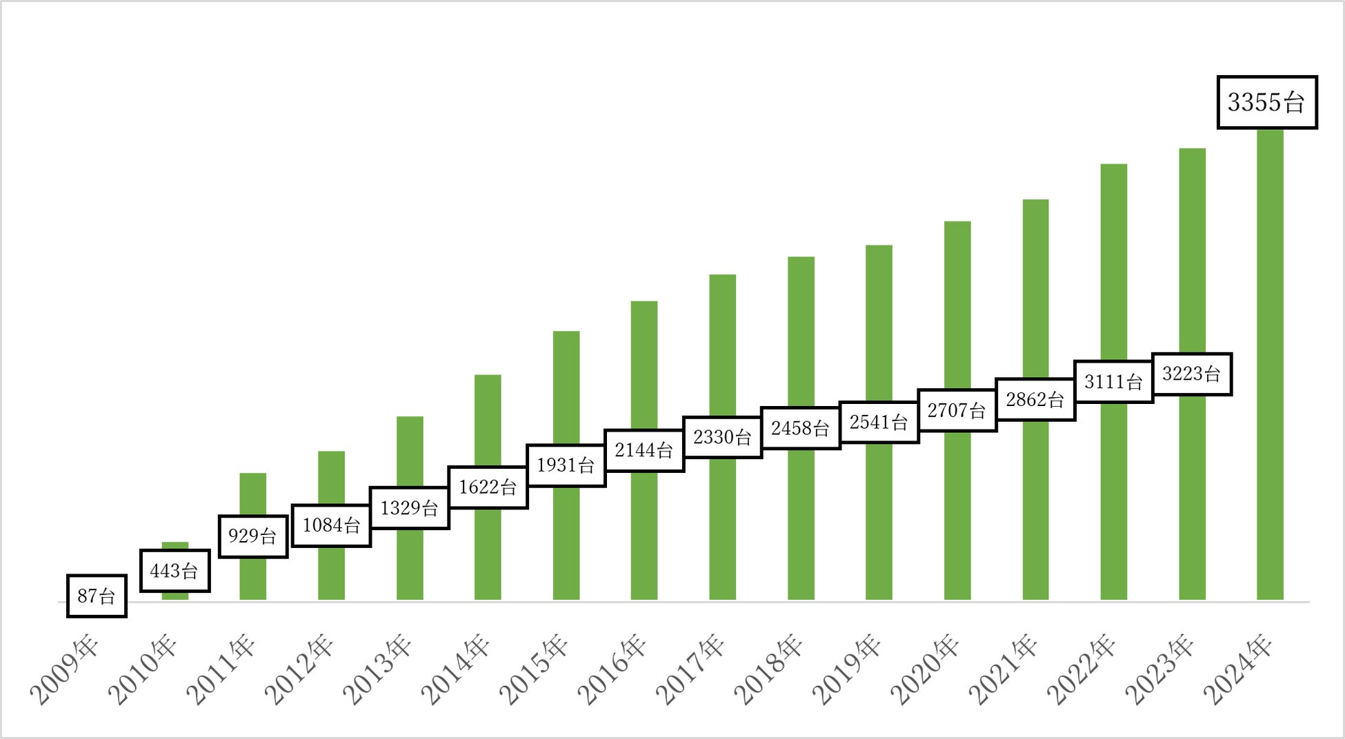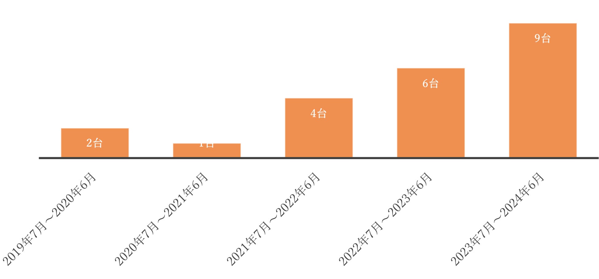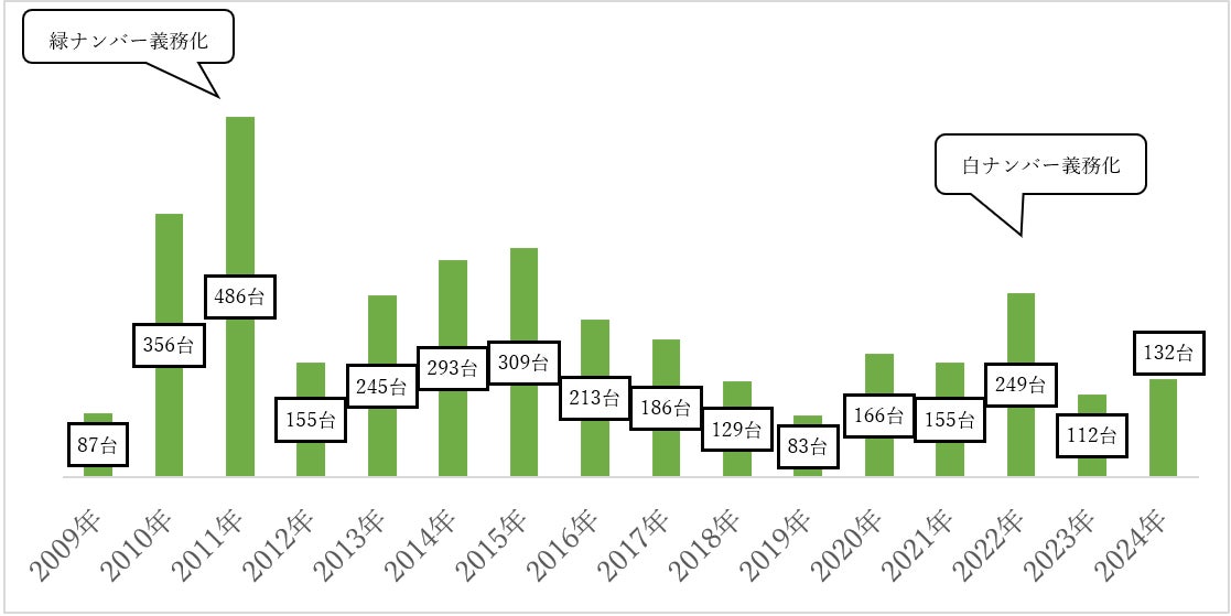 2022年度に白ナンバー義務化の影響を受け大幅に台数を伸ばし、翌年2023年度の実績は大幅に減少となりましたが、2024年に入りやや増加しました。