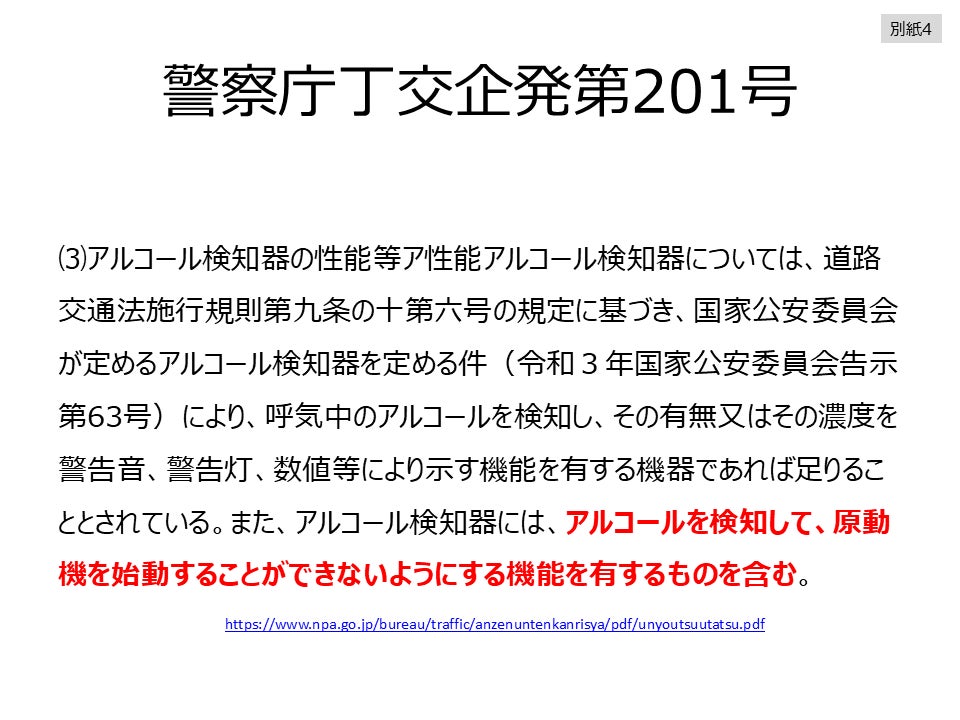 2021年6月28日、千葉県で、悲痛な飲酒運転死亡事故が起きました。加害側が「白ナンバートラック」であったことから、警察庁・公安委員会は、再発防止のため、安全運転管理者選任事業所に対し、アルコール検知器使用を義務付ける道交法施行規則の改正を行い、このなかで、アルコール・インターロック等、車載タイプも、アルコール検知器の一種であるとされました。(別紙 4)