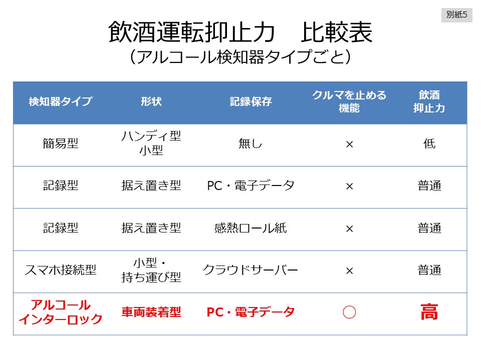 当社は、2009年9月から、運転前に呼気検査を行いアルコールが検知されるとエンジンがかからない飲酒運転防止システム「呼気吹き込み式アルコール・インターロック」を販売しています。現在、アルコール検知器は多種多様なものがありますが、「運転前に必ず呼気をチェックし記録を残し、検知したらクルマが動かない」このような強制力のある検知器は、アルコール・インターロック装置だけです。(別紙 5)