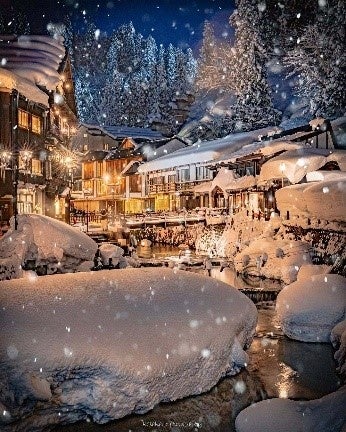 降り積もる雪とあたたかな灯りが印象的な銀山温泉の一枚。