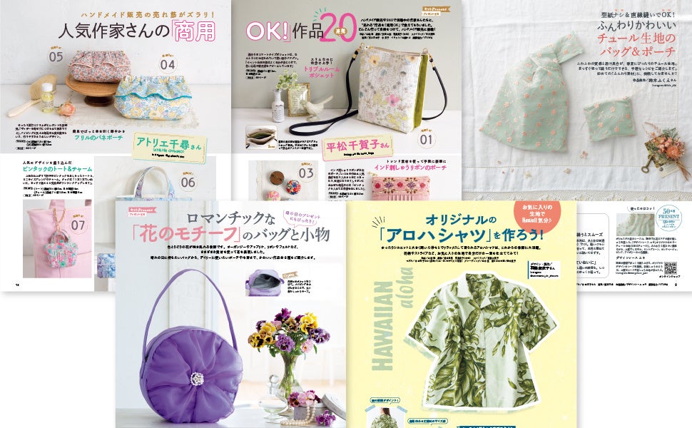 大特集「ハンドメイド販売」では、売れ筋「商用OK」作品を20連発でご紹介、作家さんたちの販売テクがわかる「ROAD MAP」も必見です。「チュール生地のバッグ&ポーチ」は期間限定抽選の50名プレ付き。母の日のプレゼントにぴったりの「花モチーフのバッグと小物」、お気に入りの生地で挑戦する「アロハシャツ」などなど…ハンドメイド熱が盛り上がります!