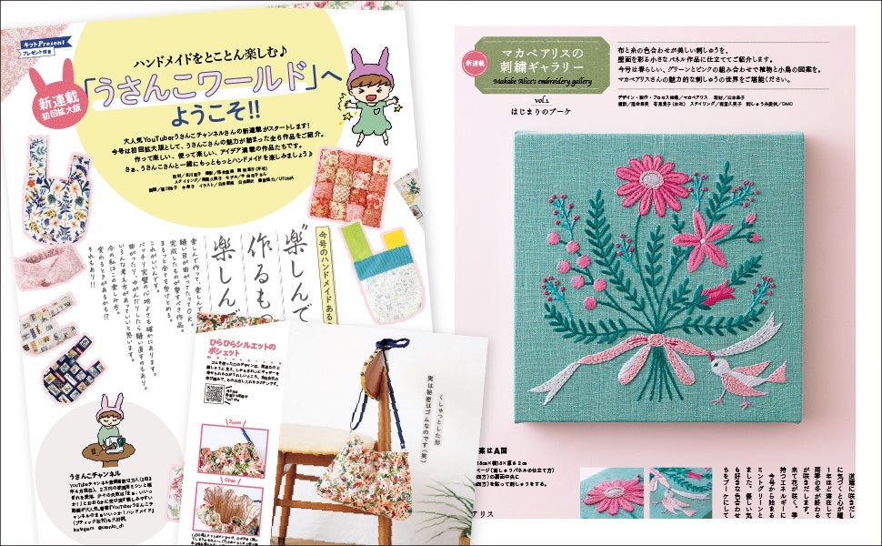 大人気YouTuberうさんこチャンネルさんの新連載は、初回拡大版でお届け! 人気刺しゅう作家・マカベアリスさんの待望の連載は、色鮮やかな季節の絵柄をパネルに仕立てます。