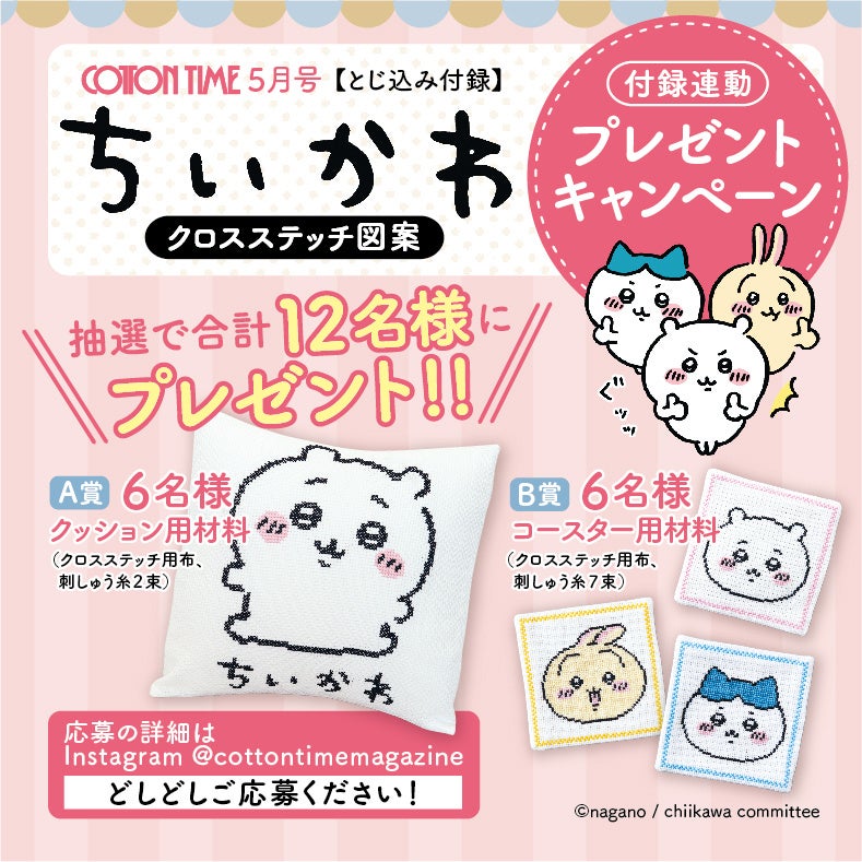 布のある居心地のいい暮らしを楽しむためのハンドメイドマガジン『COTTON TIME』(主婦と生活社刊)は、偶数月7日発売の手芸の隔月刊誌。4月7日に発売する5月号の綴じ込み付録にて、人気キャラクター「ちいかわ」の実物大クロスステッチ図案 を掲載(©nagano / chiikawa committee)。これを記念して、掲載作品が作れる「クロスステッチ用布 + 刺しゅう糸」のセット が、抽選で合計12名様に当たるプレゼントキャンペーンを実施中です。