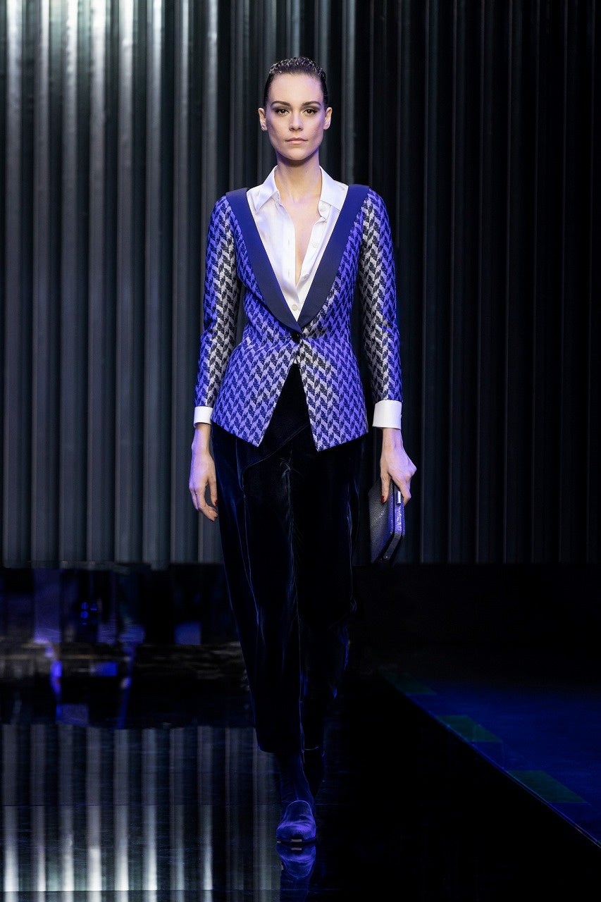 ジョルジオ・アルマーニが自身のスタイルを象徴するエッセンスを取り入れたスライドオフショルダーのジャケットは、アールデコが持つ、儚さ、直線性、モダニズムを強調するものです。大きくあいた襟元がエレガントなジャケットは、ラペルとのコントラストカラーやジャカードのジオメトリック柄、ミニマルなシルエットが特徴です。ベルベットのパンツや、スパンコールレギンスといった特徴ある異素材との合わせが今年流です。